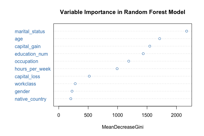 Some predictors provide direct numeric information, for example education_num, which measures years of formal education, while others encode categorical information with many levels. In particular, native_country contains 42 distinct categories, a feature that motivates the preprocessing and grouping steps discussed later in the case study. The diversity of variable types and levels makes the adult dataset well suited for illustrating how decision trees and random forests handle mixed data structures in classification tasks.