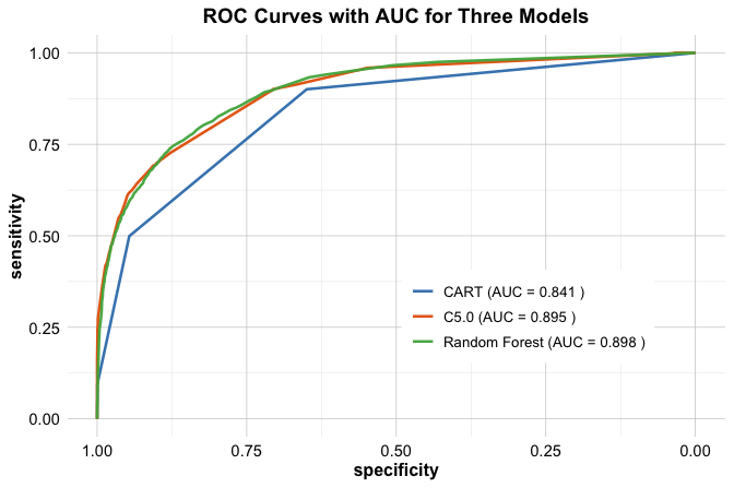 In the ROC plot, the blue curve represents CART, the orange curve represents C5.0, and the green curve represents Random Forest. Take a moment to study the curves: Which model consistently stays closest to the top-left corner (the sweet spot for perfect classification)?