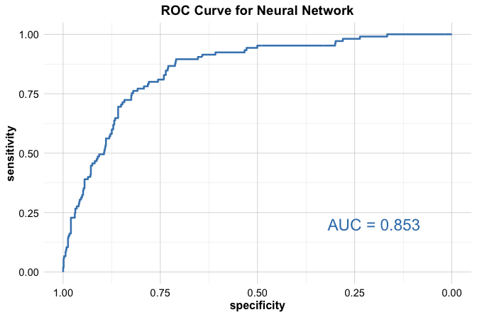 Practice: Using the 70% training and 30% test split introduced earlier, train the neural network model and report the corresponding ROC curve and AUC value. Compare these results with those obtained using the 80% training and 20% test split. Discuss possible reasons for any differences observed and reflect on what this comparison reveals about the stability of performance estimates.