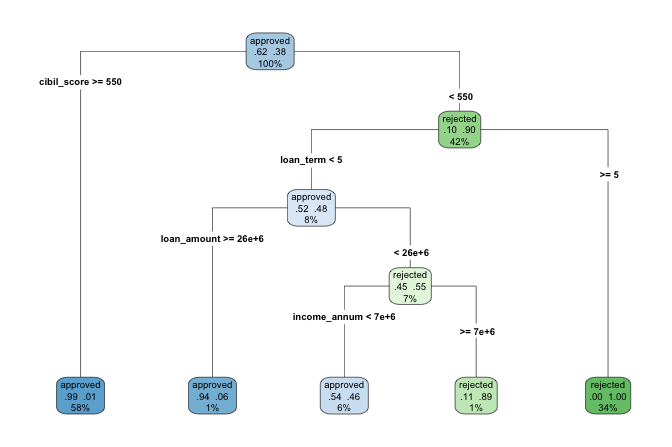 Figure 12.1 illustrates a classification tree trained on the loan dataset introduced in Chapter 9. The model predicts whether a loan application would be approved or rejected based on features such as cibil_score, loan_term, loan_amount, and income_annum. Internal nodes represent splitting rules, and terminal nodes (leaves) provide the predicted class together with class probabilities.
