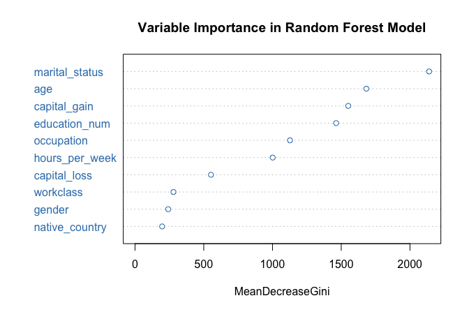Some predictors provide direct numeric information, for example education_num, which measures years of formal education, while others encode categorical information with many levels. In particular, native_country contains 42 distinct categories, a feature that motivates the preprocessing and grouping steps discussed later in the case study. The diversity of variable types and levels makes the adult dataset well suited for illustrating how decision trees and random forests handle mixed data structures in classification tasks.