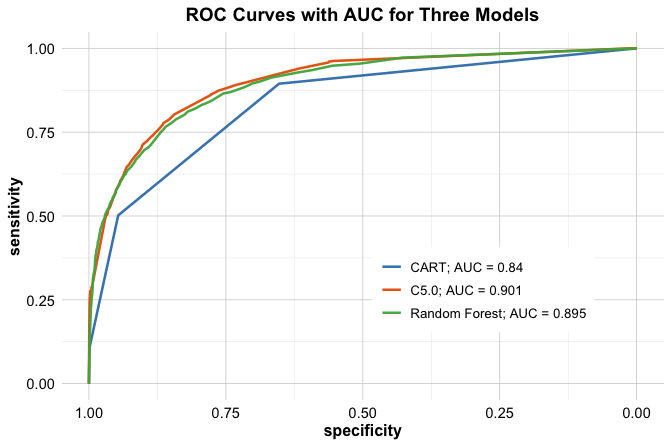 The AUC values provide a concise summary of these curves. CART achieves an AUC of 0.84, C5.0 an AUC of 0.901, and Random Forest an AUC of 0.895. Among the three models, Random Forest attains the highest AUC, although the difference relative to C5.0 is small.