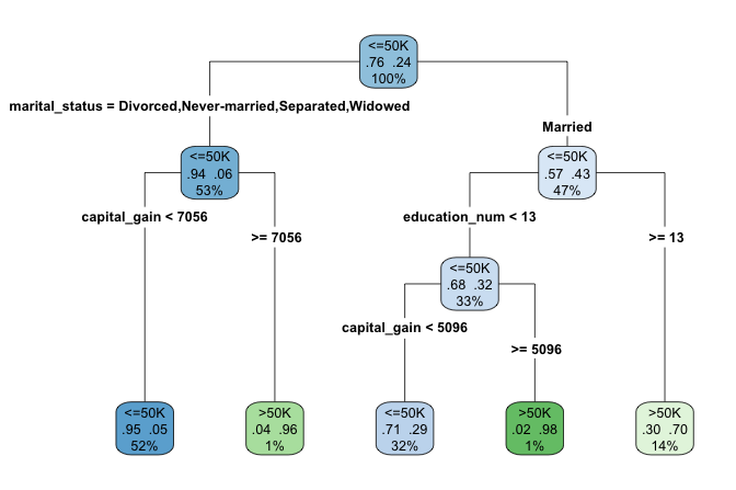 >50K 889 1386Using this cutoff, the total number of correctly classified observations is 8189 for CART, 8393 for C5.0, and 8381 for Random Forest. Among the three models, C5.0 yields the highest number of correct classifications at this threshold, reflecting its greater flexibility in partitioning the feature space.