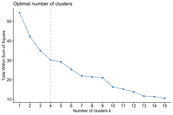 As shown in Figure 13.8, the WCSS decreases rapidly for small values of \(k\) and begins to level off around \(k = 4\). This pattern suggests that four clusters provide a reasonable trade-off between model simplicity and within-cluster cohesion for this dataset. As with all clustering heuristics, this choice should be interpreted in light of domain knowledge and the substantive meaning of the resulting clusters.