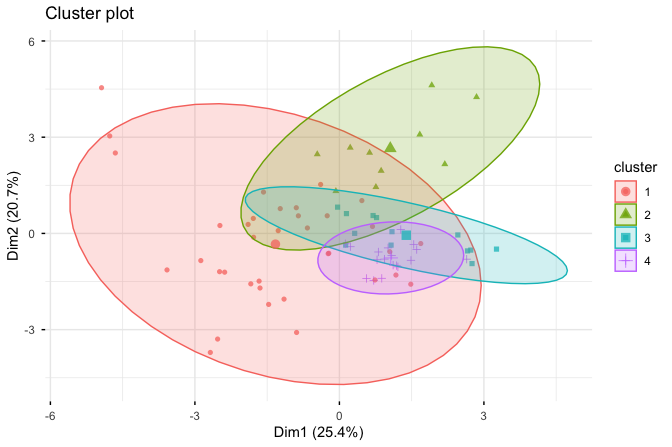 To gain insight into the clustering results, we visualize the four groups using the fviz_cluster() function from the factoextra package: