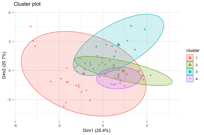 To gain insight into the clustering results, we visualize the four groups using the fviz_cluster() function from the factoextra package: