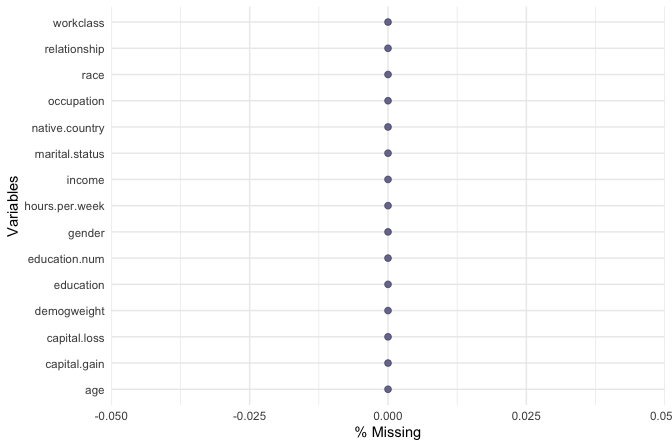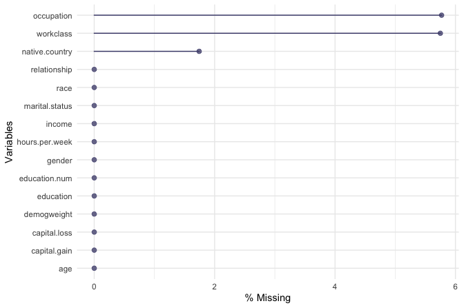 adult$workclass <- fct_collapse(adult$workclass, "Unemployed" = c("Never-worked", "Without-pay"))