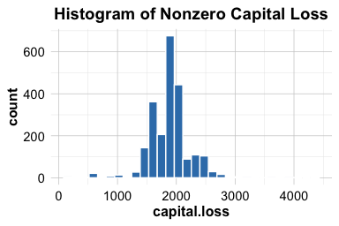 Among those with a nonzero capital loss, the majority of values are concentrated below 500. However, a small number of observations exceed 4,000. Despite their rarity, these high values appear to follow a relatively smooth and symmetric distribution, suggesting they reflect genuine variation in the data rather than data entry errors.