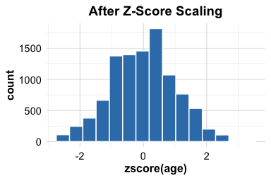 It is important to note that z-score scaling does not make a variable normally distributed. It standardizes the location and spread but preserves the underlying shape of the data. If a variable is skewed before scaling, it will remain skewed after transformation.