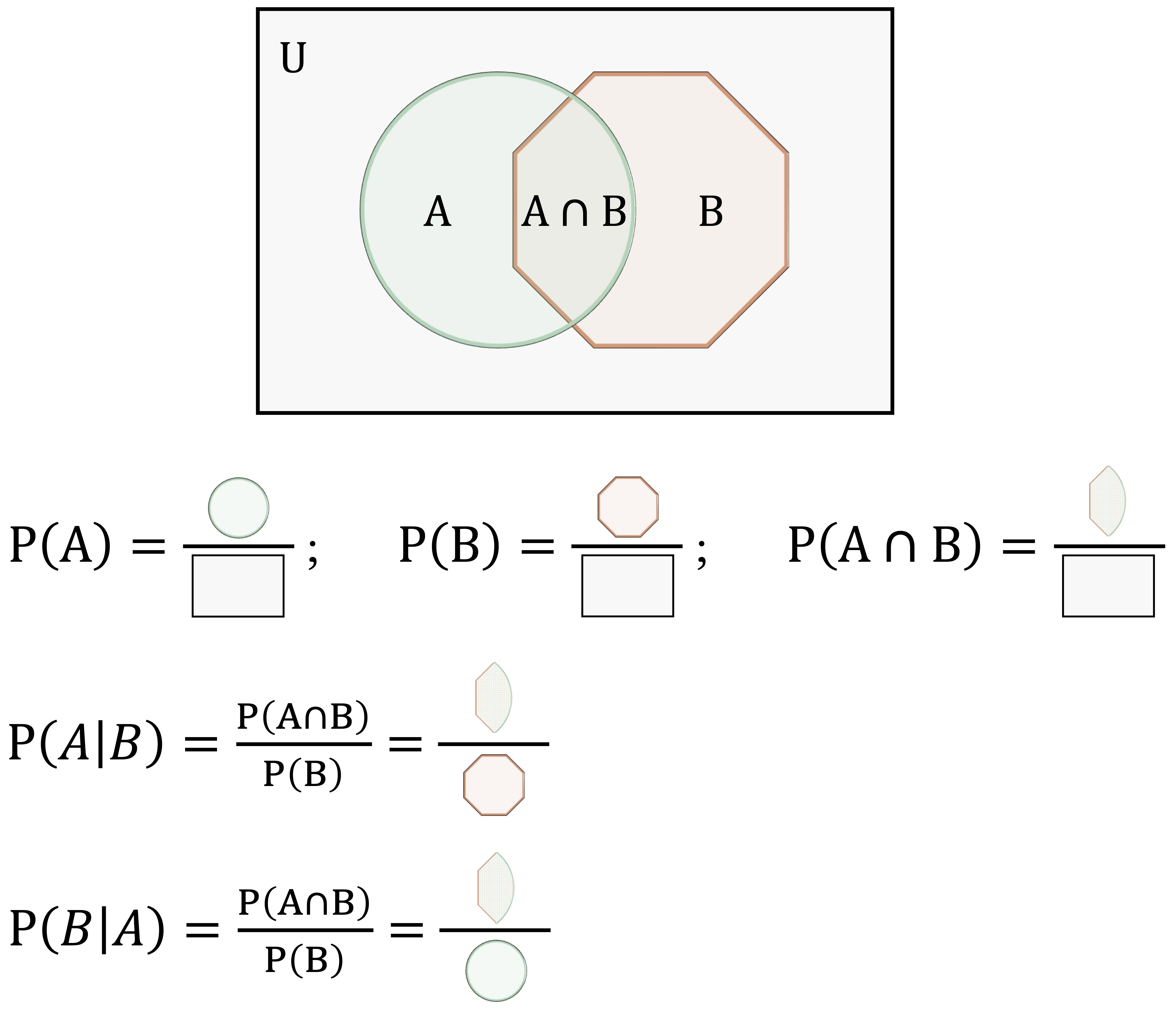 To clarify the components of Bayes’ Theorem, Figure 9.1 provides a visual interpretation using a Venn diagram. The overlapping region between the circle and the octagon represents the joint probability \(P(A \cap B)\), while the entire area of the octagon corresponds to the marginal probability \(P(A)\), and the entire area of the circle corresponds to \(P(B)\).